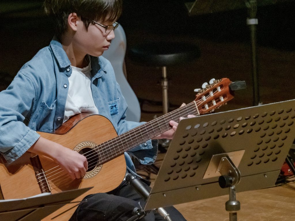昭和の音楽やアニメが大好きなMくん。今回演奏した2曲には、ゲネラルパウゼ(曲の流れを一瞬止めて緊張感を生み、次に始まる音をより引き立てる技法)をはじめ、拍子のチェンジ、フェルマータ、リタルダンドなど、呼吸を合わせる場面が多くありましたが、とてもよくできていたと思います。ギターの技術的な面だけでなく、音楽的にも大きな成長を感じました。