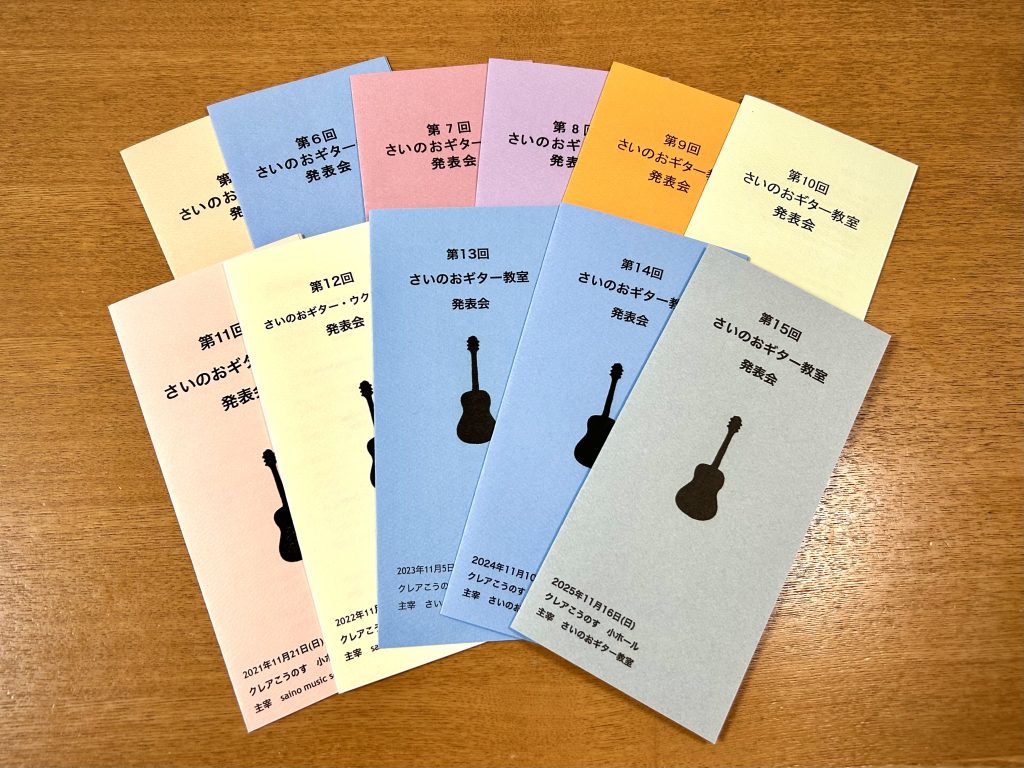 発表会のプログラムは、第5回からこのデザインで作成しています。一昨年、昨年は鮮やかな空色でしたが、今年は用紙を買いに行った日が曇天だったこともあり、なんとなく「ブルークラウド」という少し渋めのカラーを選びました。今回も例によって家族に手伝ってもらい、とても助かりました。