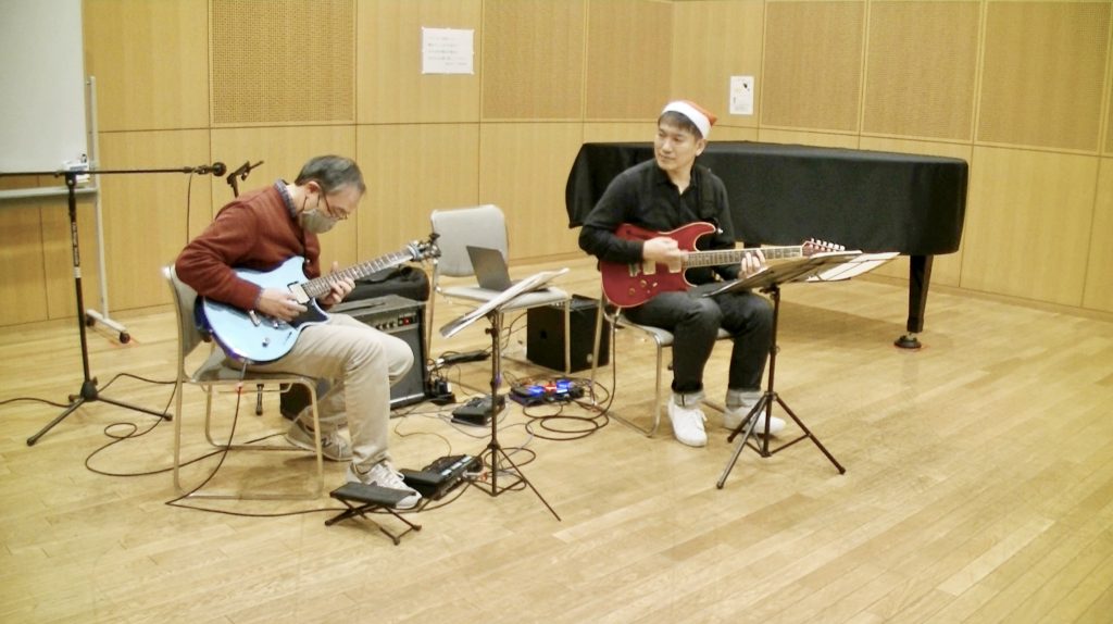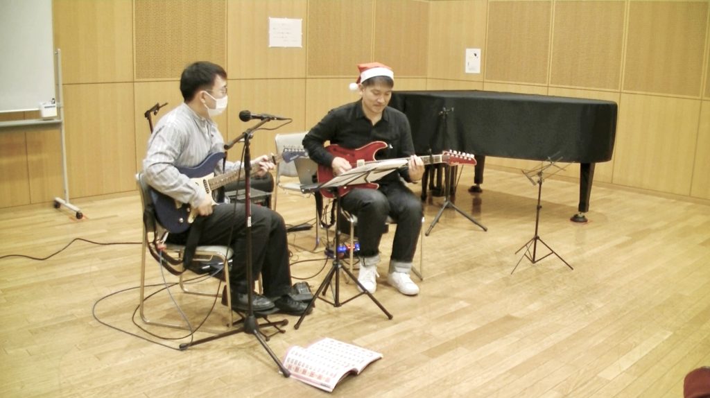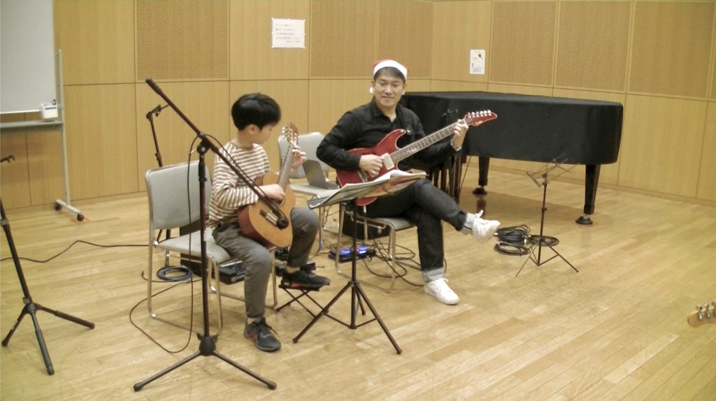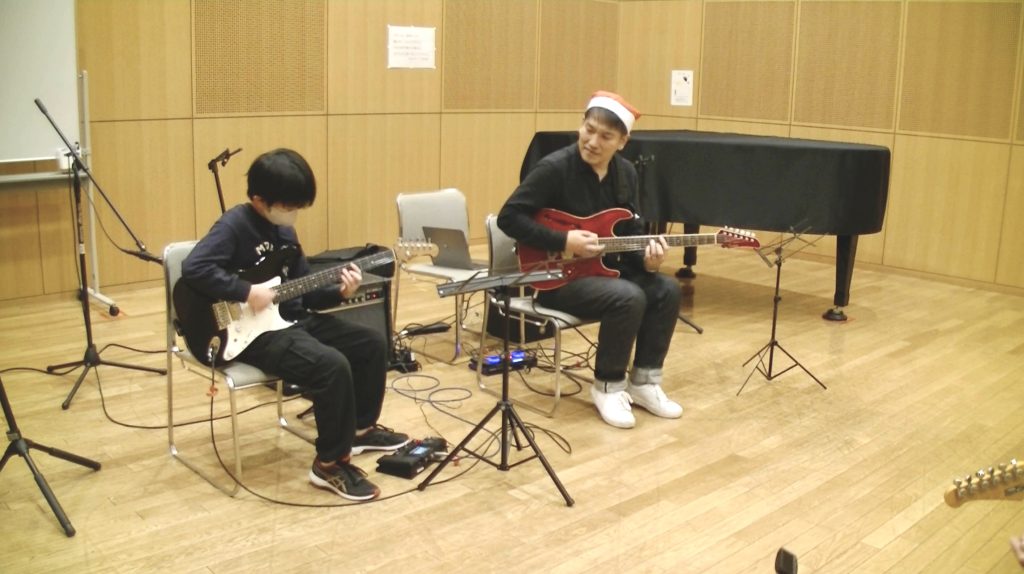 最後はクリスマスソングを、参加者みんなで合奏しました。エレキギター4本にクラシックギター1本という五重奏編成で、少し実験的な試みではありましたが、回数を重ねるうちに音が自然とまとまり、3回目にはしっかりと一体感のある演奏に。試行錯誤しながら音を合わせたこの時間も含めて、思い出に残る、いいクリスマスの記念になりました。